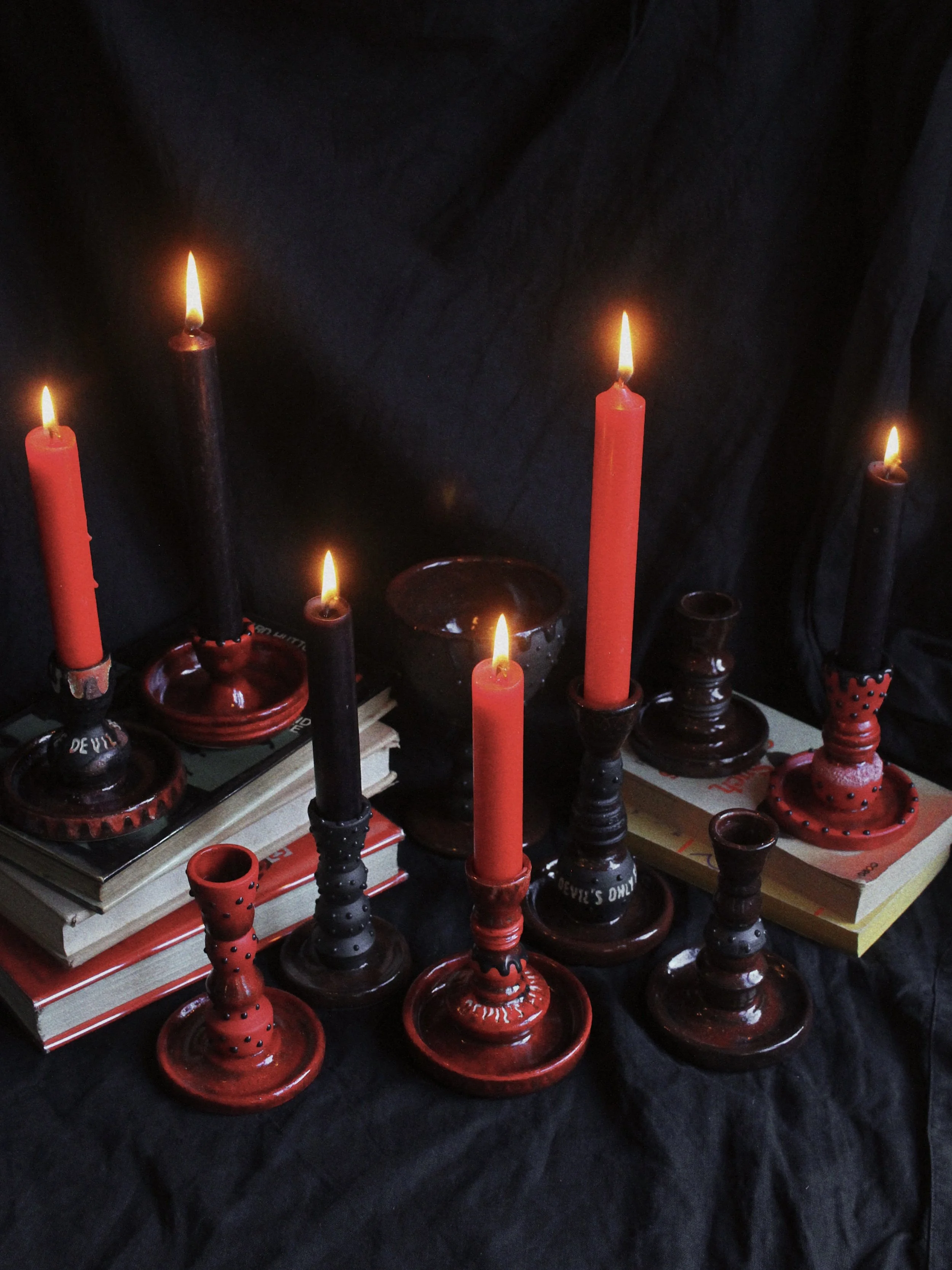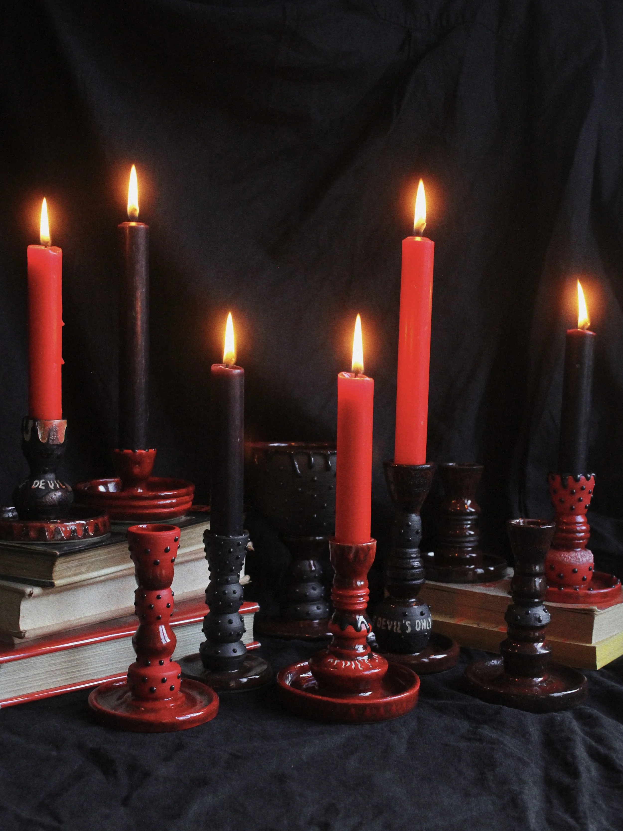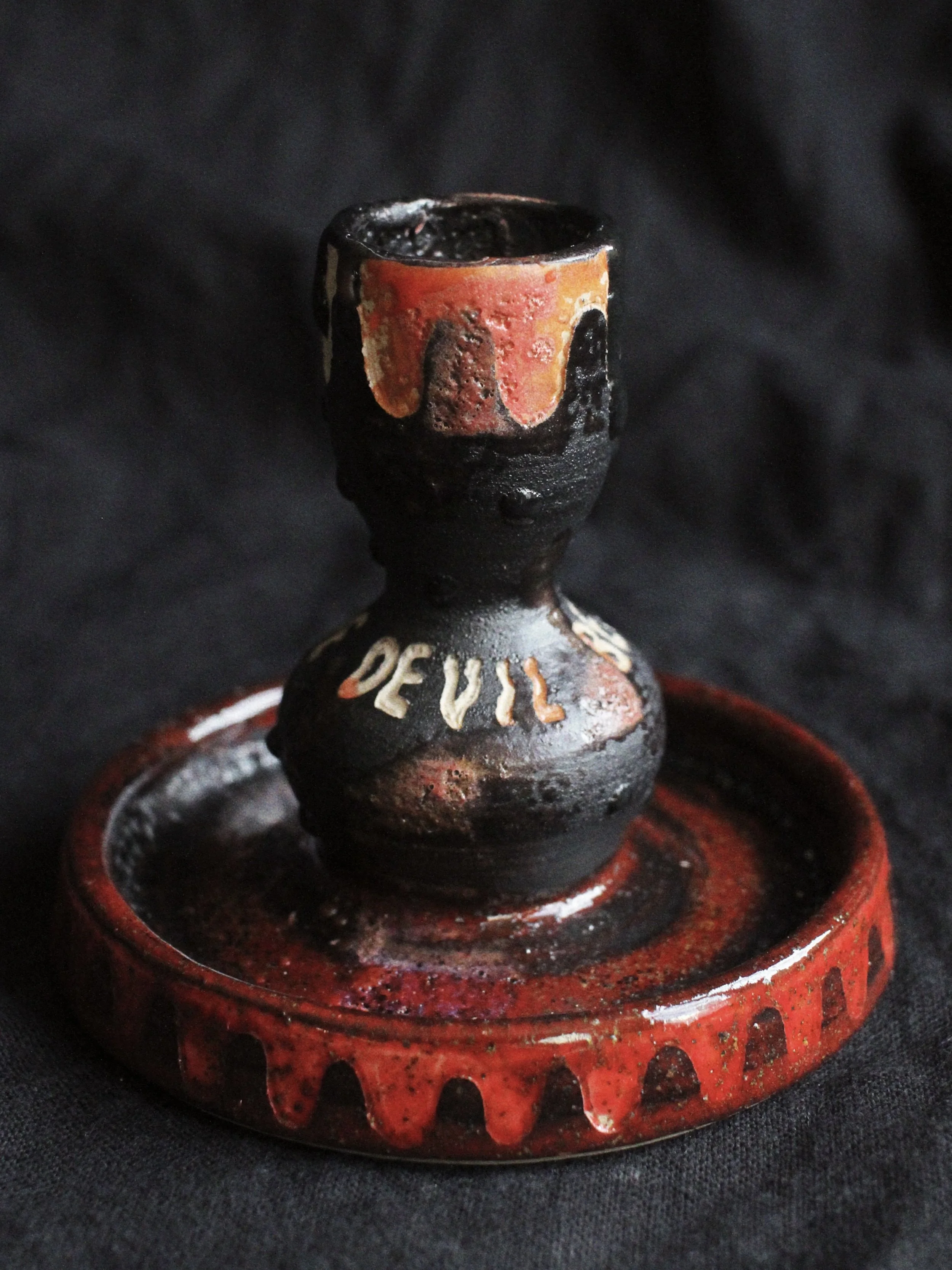 This collection of candlestick holders and goblets draws on the visual language of ritual, religion and folklore. Deep red and black glazes evoke fire, blood and ash, while studded surfaces and dripping forms suggest melted wax and ceremonial objects handled over time. Their stacked, altar-like silhouettes recall traditional church candlesticks, yet small inscriptions and darker motifs hint at the presence of the devil within moral tales and superstitions. In European folklore, candles often marked moments of prayer, protection or summoning, their light symbolising both divine guidance and uneasy encounters with the supernatural. Arranged together, the pieces resemble a small ritual setting, where flame, vessel and shadow transform everyday ceramics into objects that feel part devotional tool, part theatrical relic.