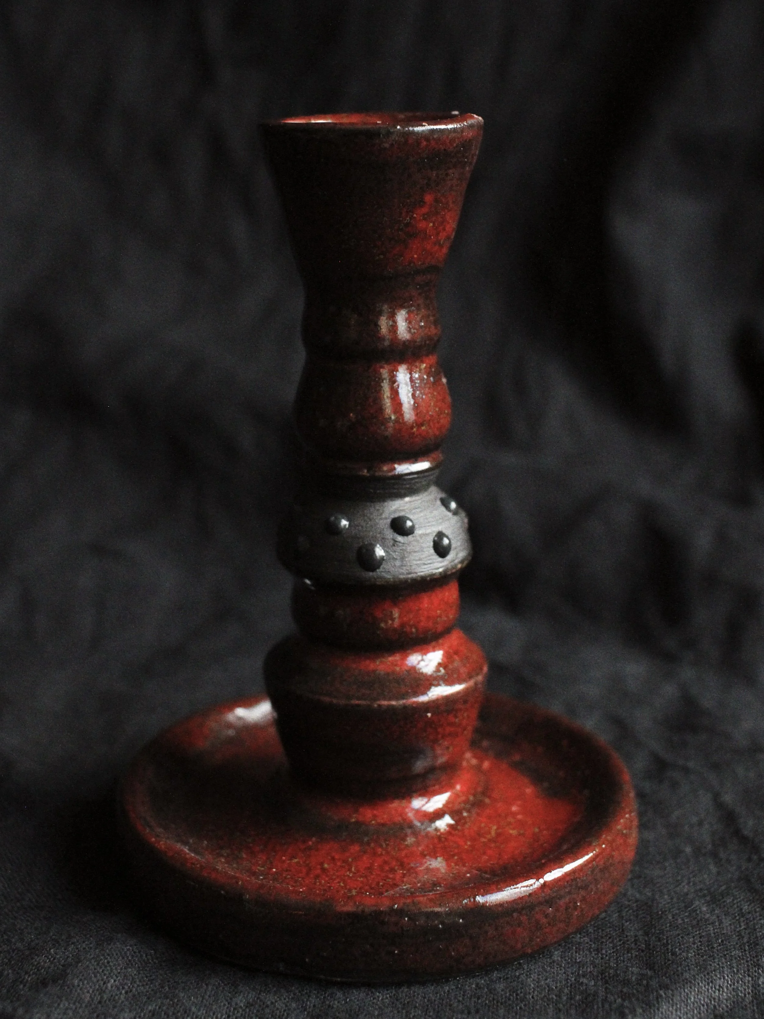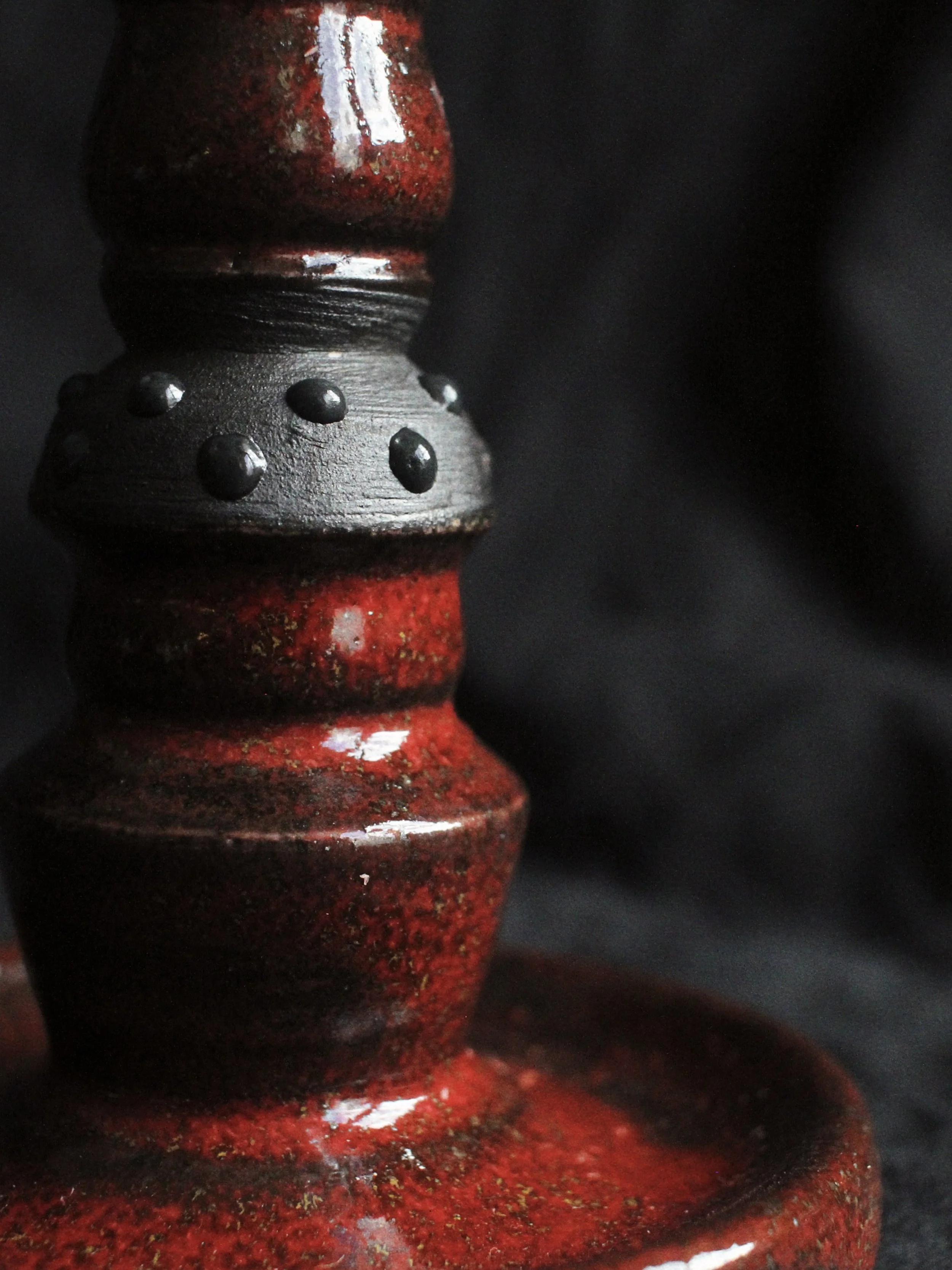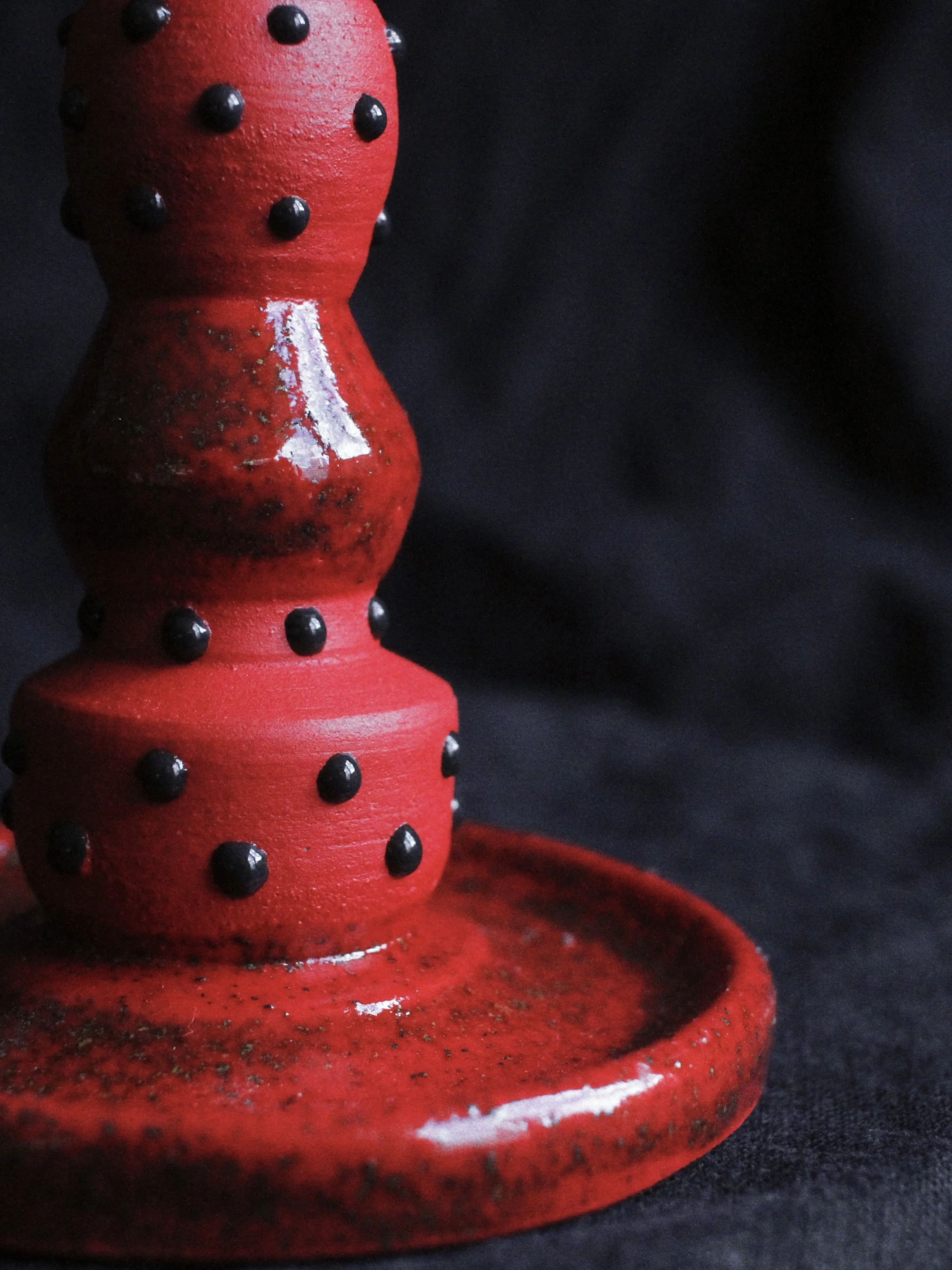 This collection of candlestick holders and goblets draws on the visual language of ritual, religion and folklore. Deep red and black glazes evoke fire, blood and ash, while studded surfaces and dripping forms suggest melted wax and ceremonial objects handled over time. Their stacked, altar-like silhouettes recall traditional church candlesticks, yet small inscriptions and darker motifs hint at the presence of the devil within moral tales and superstitions. In European folklore, candles often marked moments of prayer, protection or summoning, their light symbolising both divine guidance and uneasy encounters with the supernatural. Arranged together, the pieces resemble a small ritual setting, where flame, vessel and shadow transform everyday ceramics into objects that feel part devotional tool, part theatrical relic.