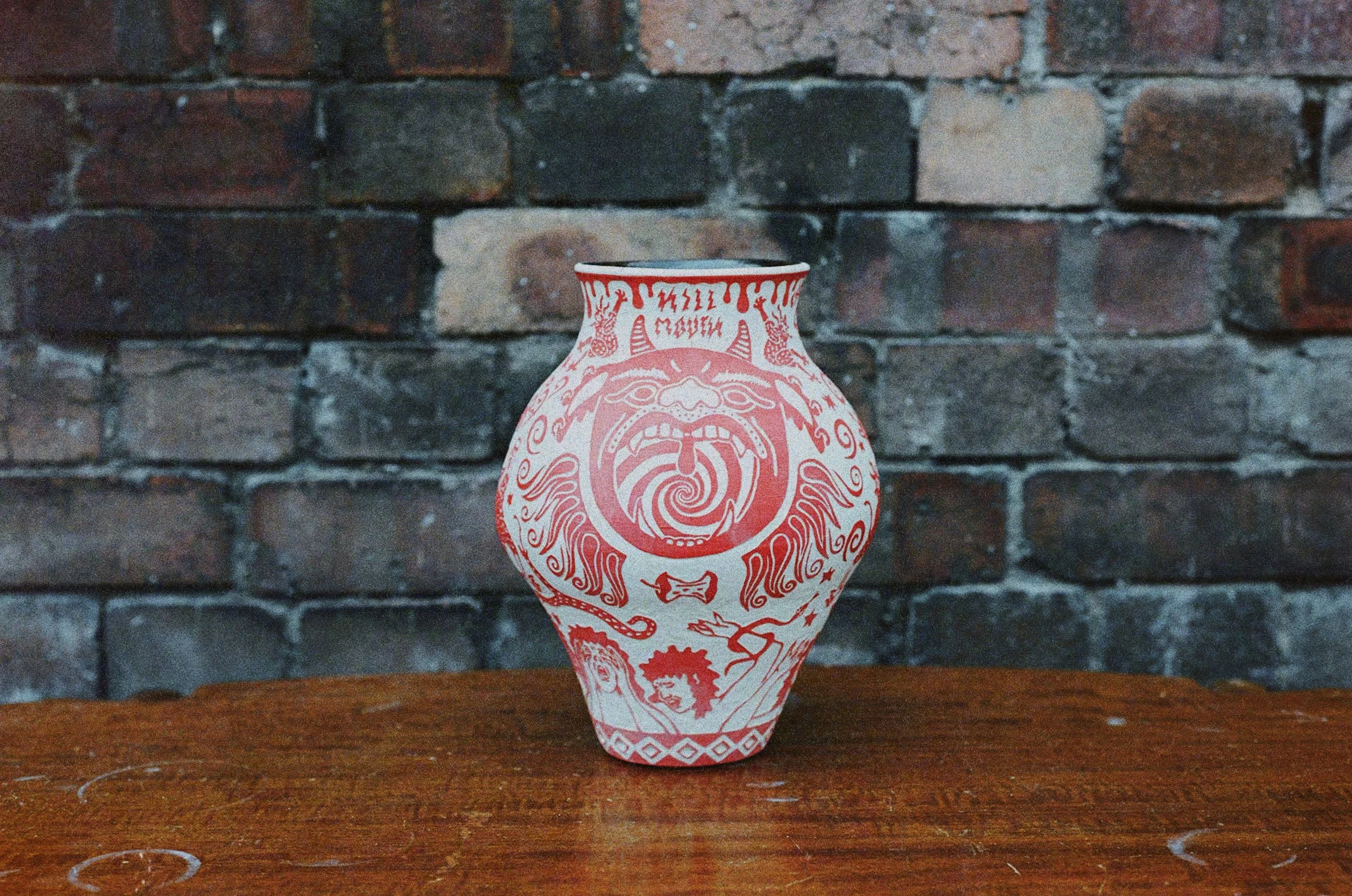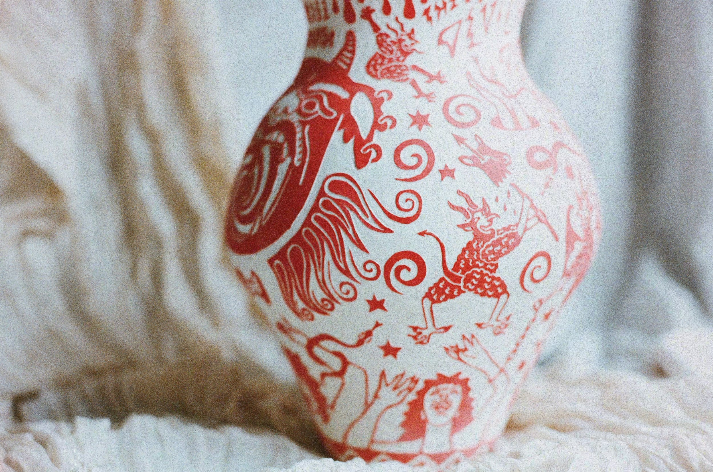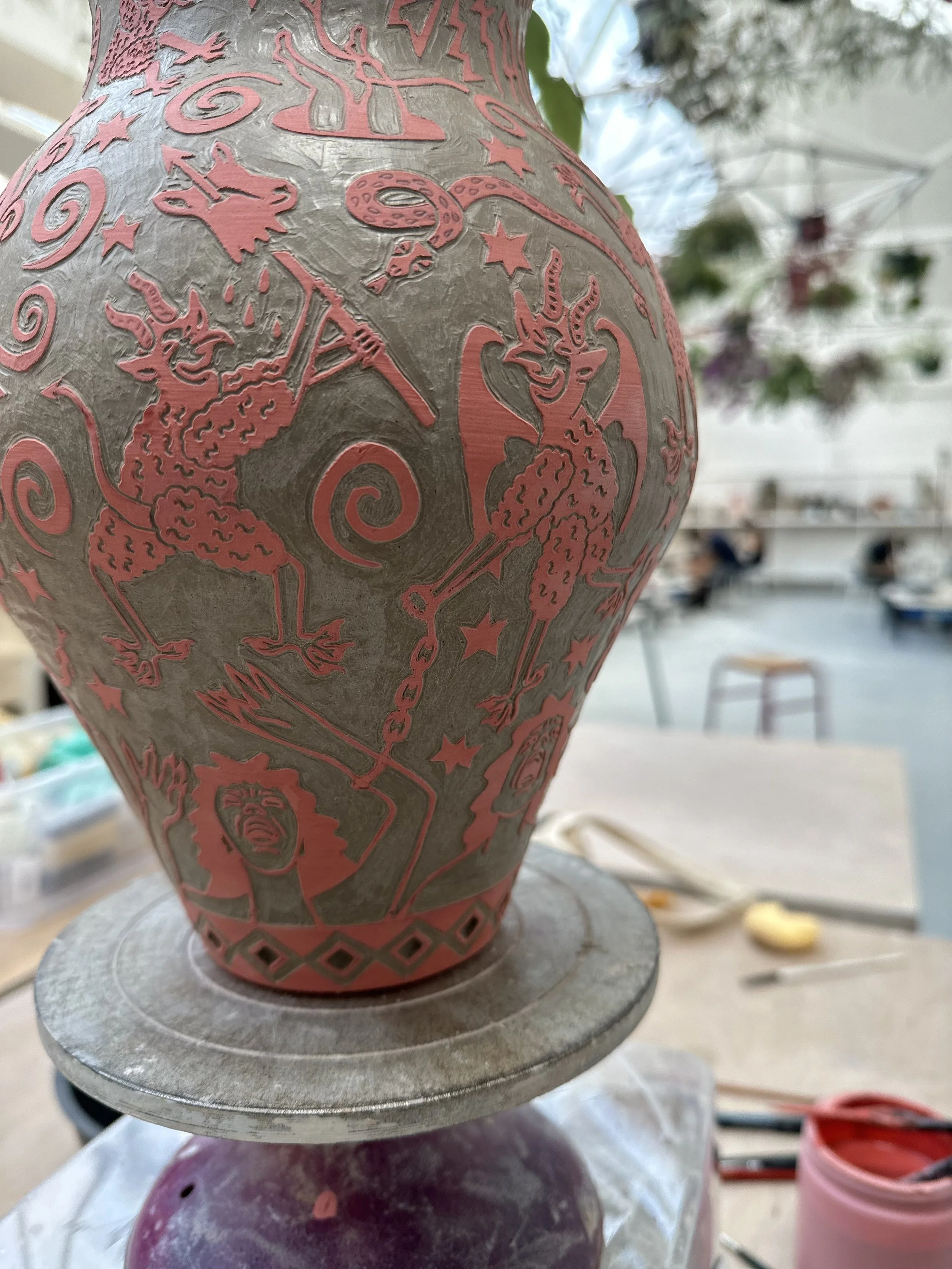 Working predominantly with stoneware clay, I apply layers of coloured slip before carving through the surface using the sgraffito technique. The process of carving away the outer skin of the vessel to reveal its image echoes my larger social practice of feminist historical recovery and archival research. Each line carved becomes a deliberate negotiation between concealment and revelation: what is visible depends on what has been removed.
