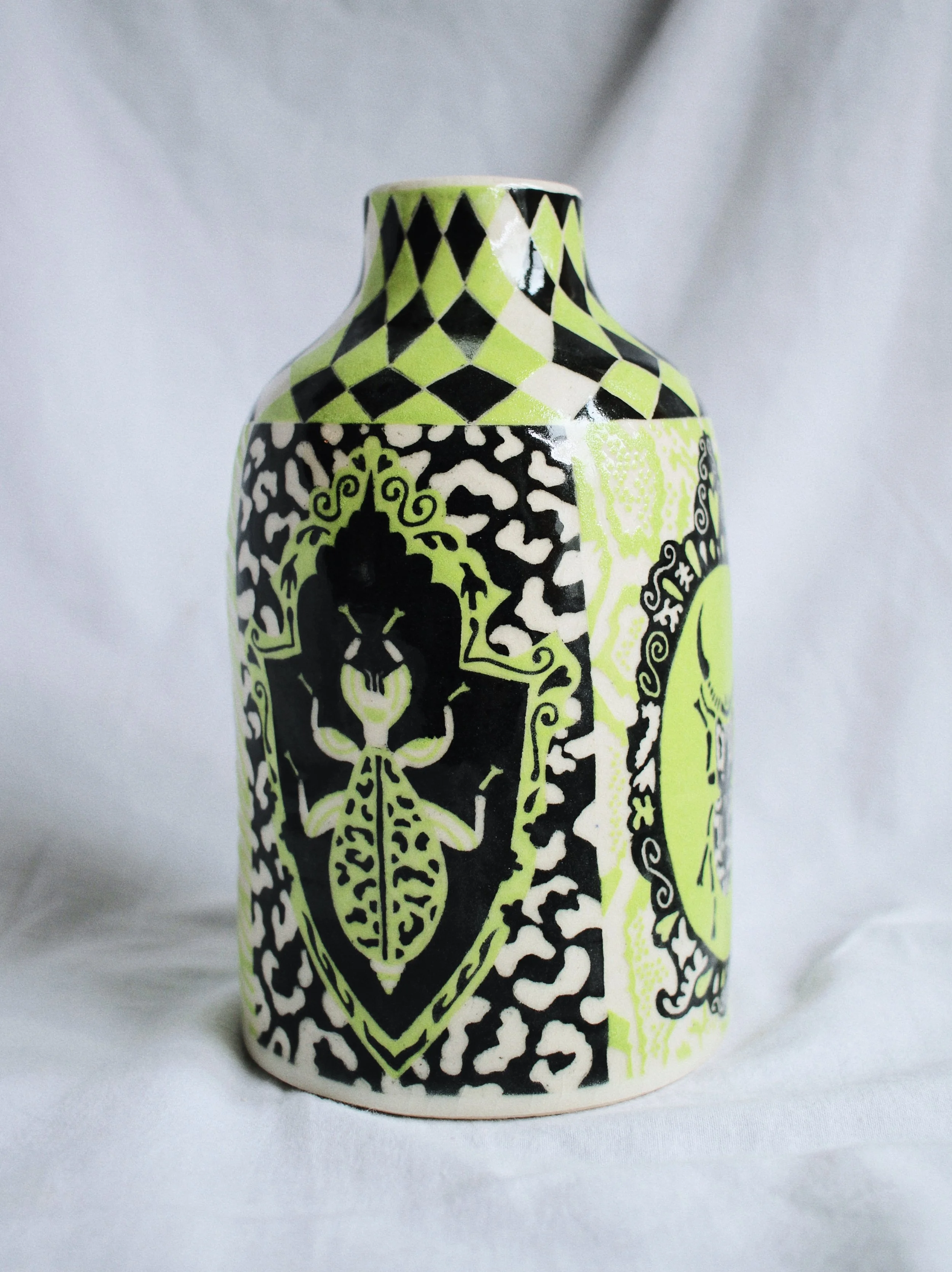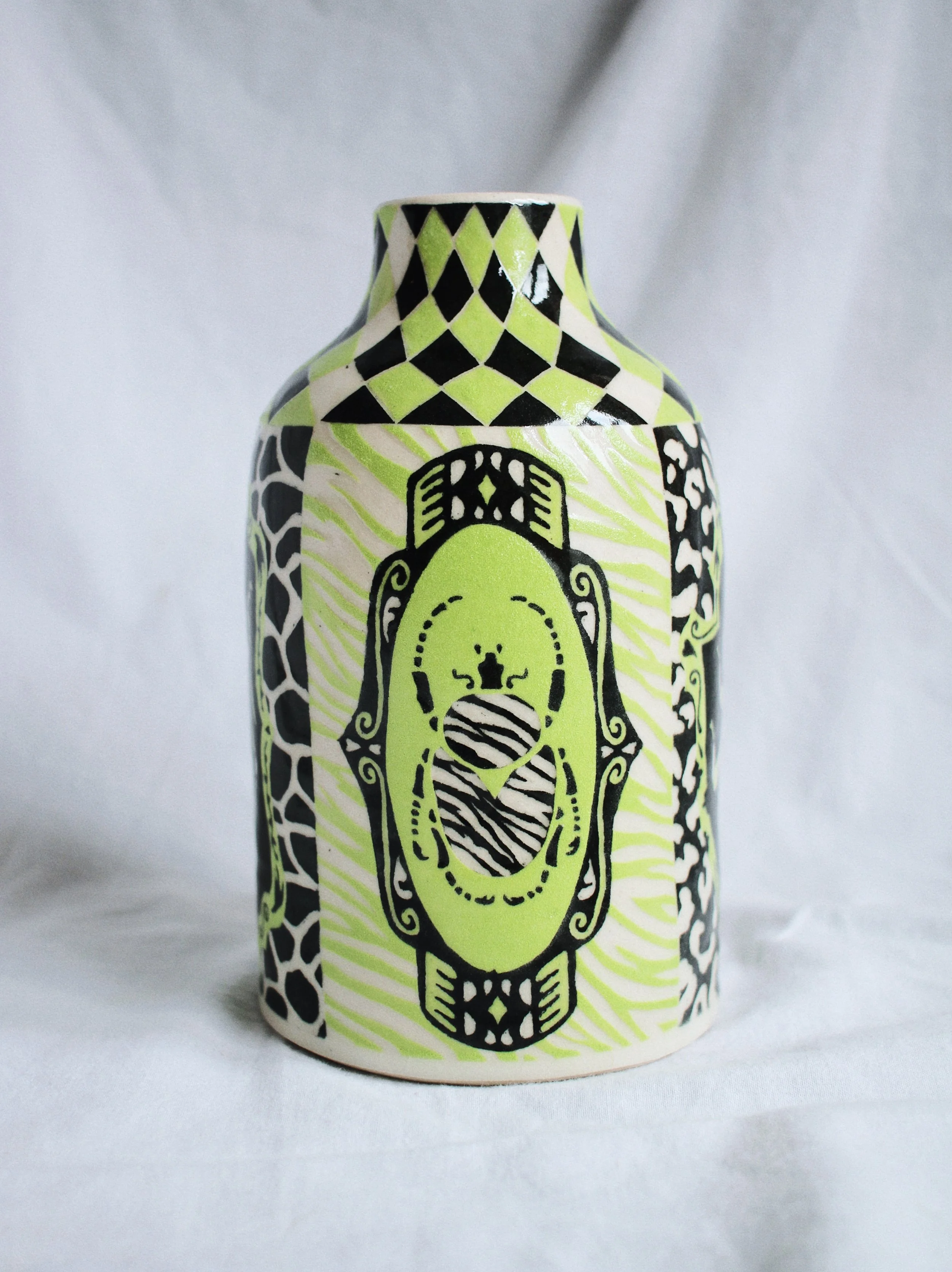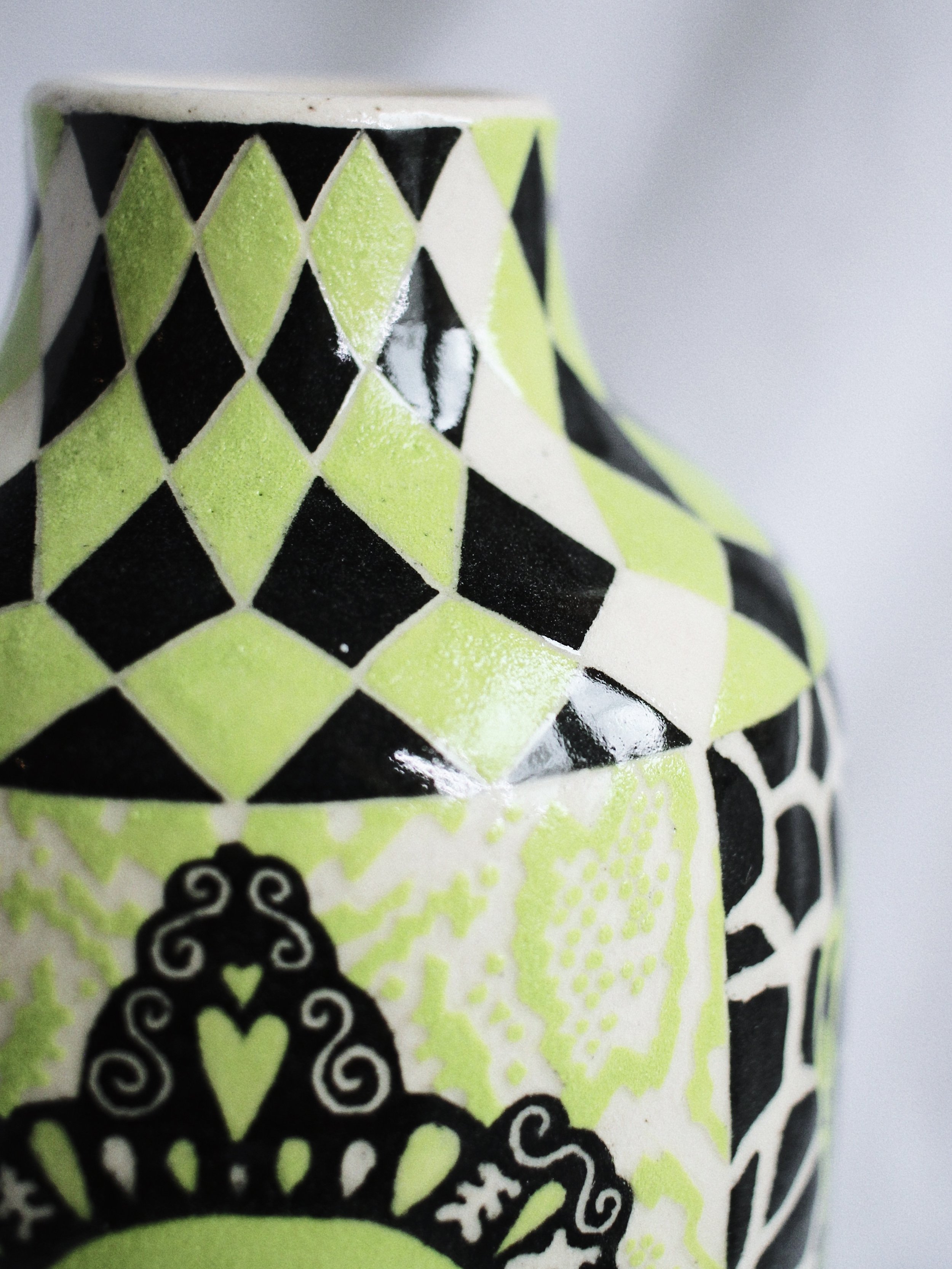 Working predominantly with stoneware clay, I apply layers of coloured slip before carving through the surface using the sgraffito technique. The process of carving away the outer skin of the vessel to reveal its image echoes my larger social practice of feminist historical recovery and archival research. Each line carved becomes a deliberate negotiation between concealment and revelation: what is visible depends on what has been removed.