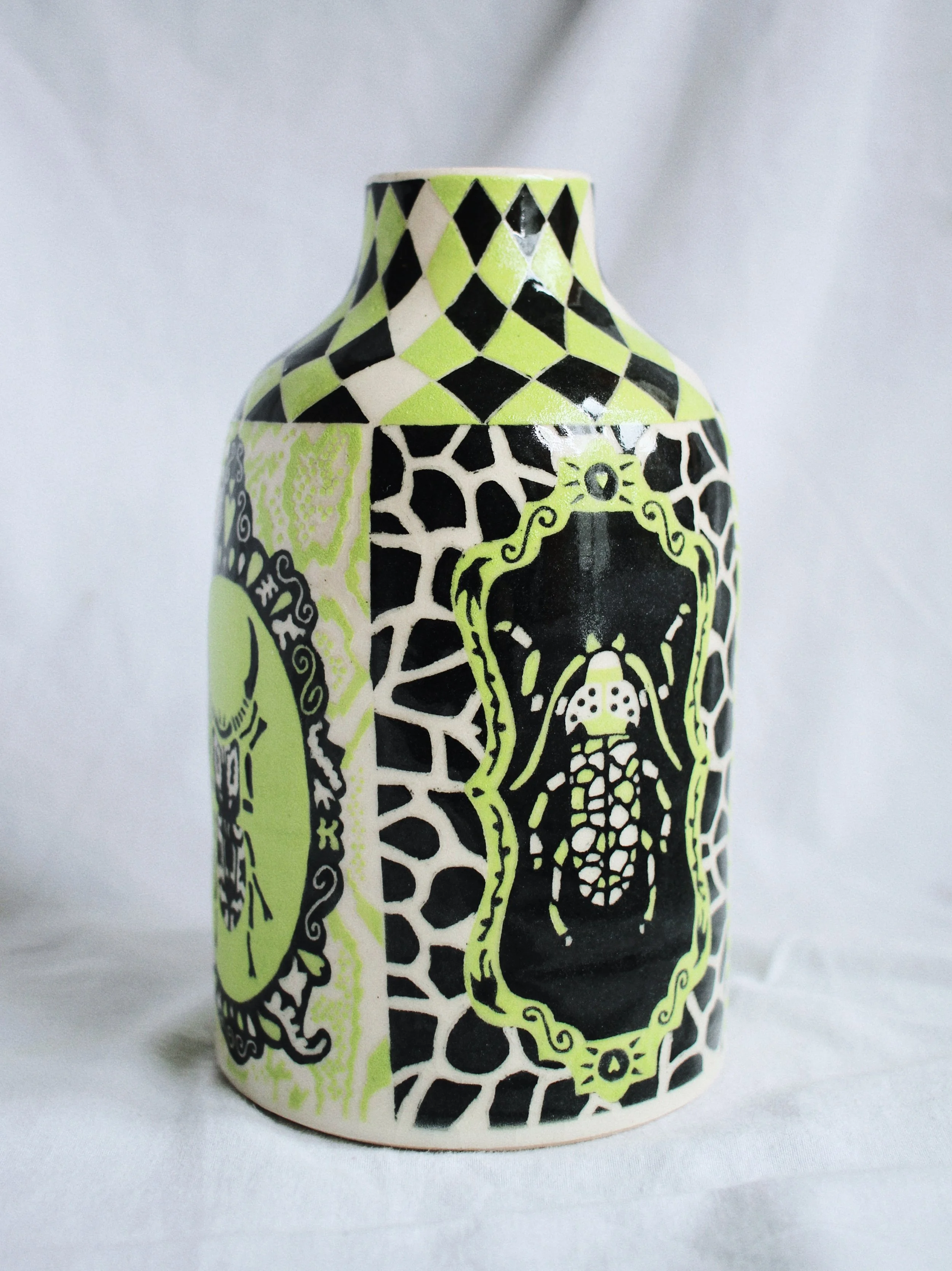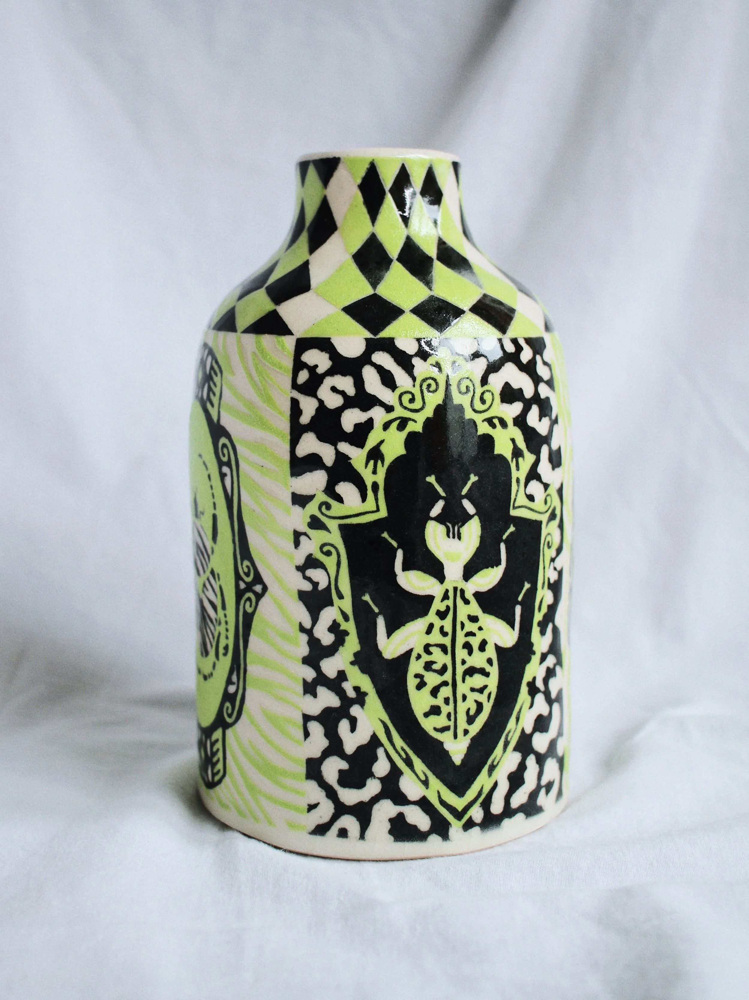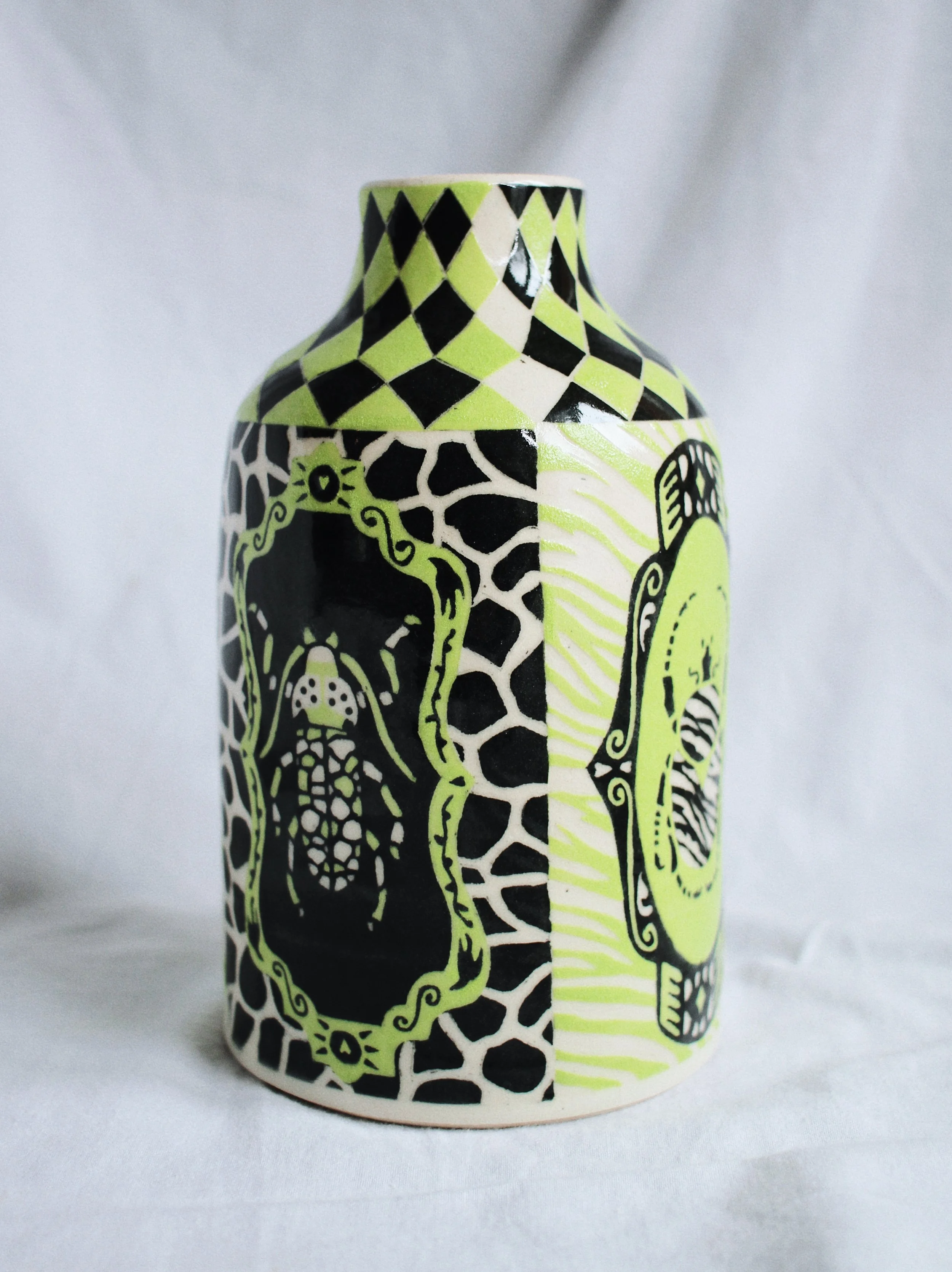 Working predominantly with stoneware clay, I apply layers of coloured slip before carving through the surface using the sgraffito technique. The process of carving away the outer skin of the vessel to reveal its image echoes my larger social practice of feminist historical recovery and archival research. Each line carved becomes a deliberate negotiation between concealment and revelation: what is visible depends on what has been removed.