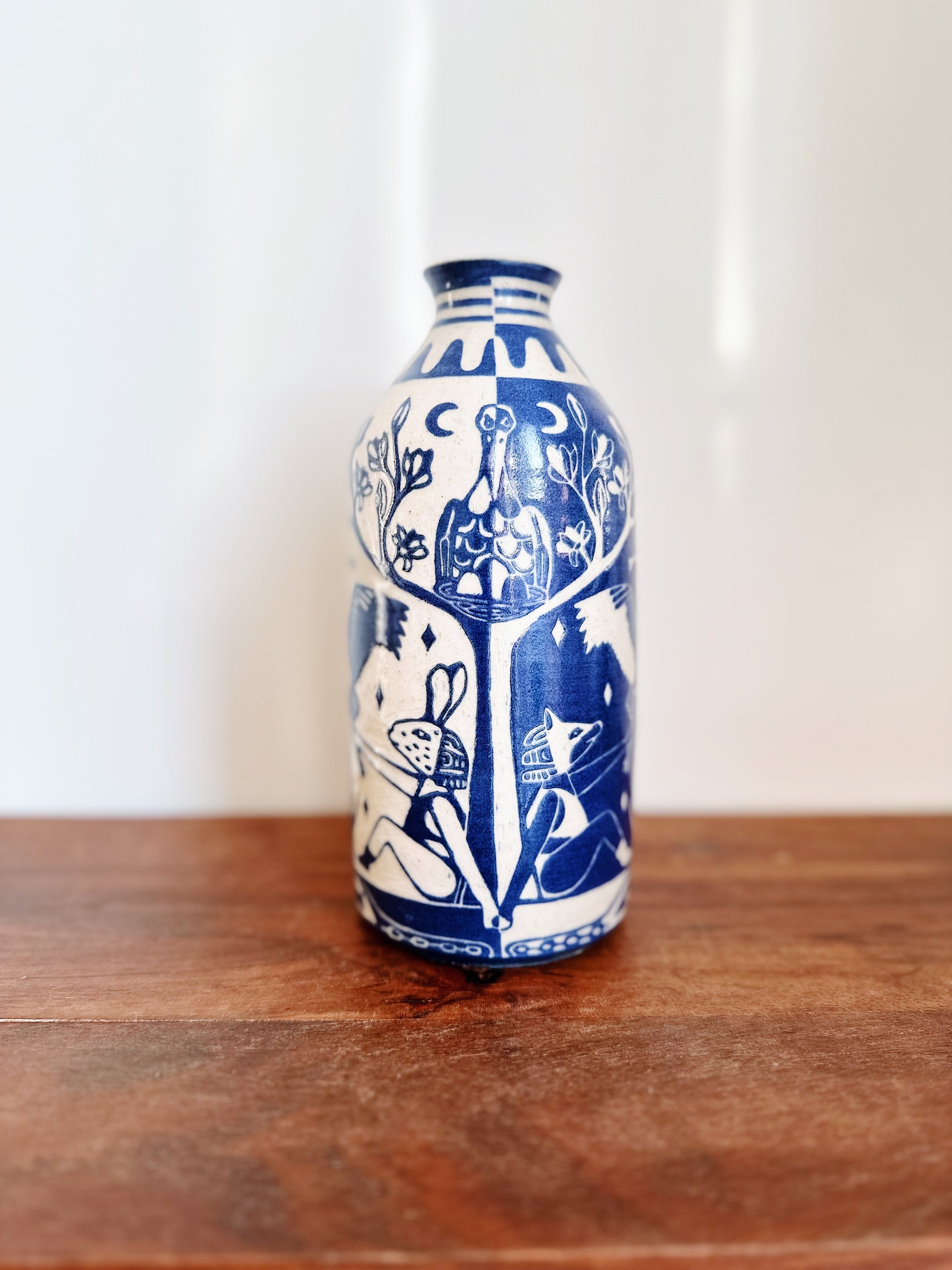 This vase draws on the unsettling edge of spring folklore, where renewal and unease often appear side by side. The surface is filled with winding plants, birds and small masked figures that echo seasonal rituals celebrating the arrival of spring. Among the imagery, girls appear holding hands in a chain, their faces hidden behind masks while they grasp tightly onto birds, preventing them from flying away. The scene hints at folk customs where animals, costumes and circular dances symbolised the turning of the seasons, yet it also carries a darker tension. The captured birds suggest a fragile balance between nature and control, while the masked figures evoke the eerie anonymity of traditional spring festivals, where joy, superstition and quiet menace often coexist.