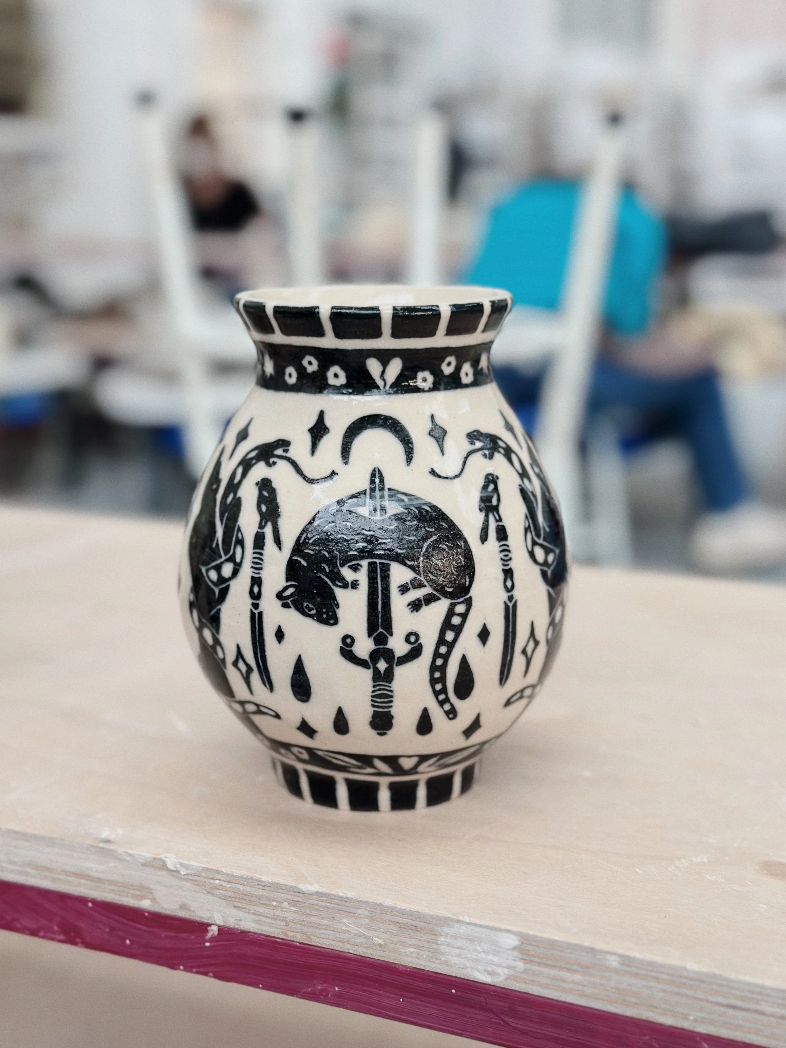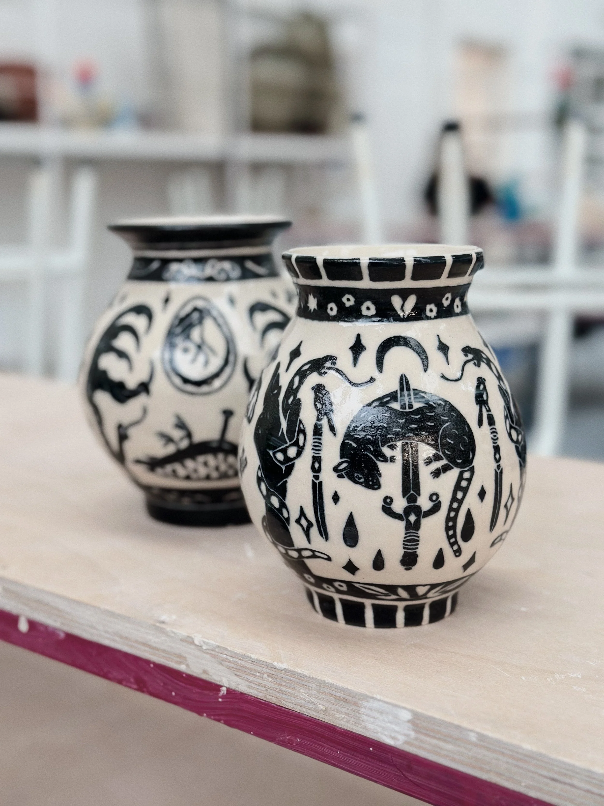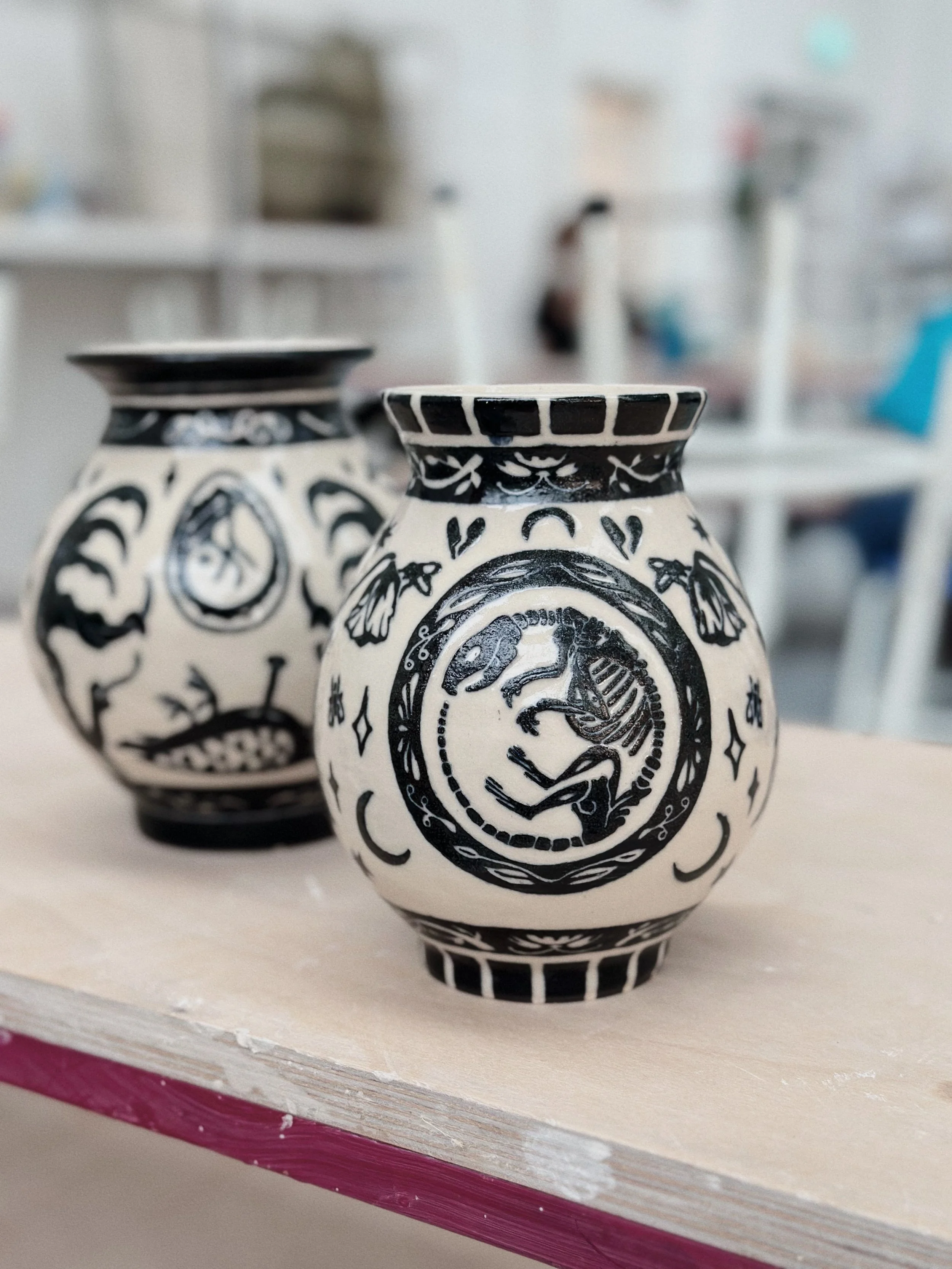 Working predominantly with stoneware clay, I apply layers of coloured slip before carving through the surface using the sgraffito technique. The process of carving away the outer skin of the vessel to reveal its image echoes my larger social practice of feminist historical recovery and archival research. Each line carved becomes a deliberate negotiation between concealment and revelation: what is visible depends on what has been removed.